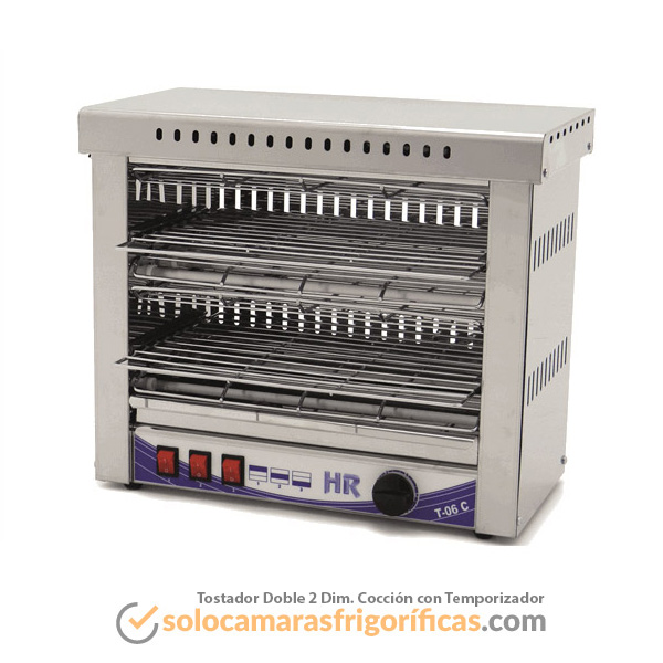 Tostador doble 2 dimensiones de cocción con temporizador blindado Fainca 3KW,Peso 10Kg,bandeja de migas extraíble,cuerpo en acero inoxidable,resistencia blindada o cuarzo,parrilla extraíble,resistencias protegidas por parrillas, opcional temporizador 15min.Interruptor por cada planta de resistencias.